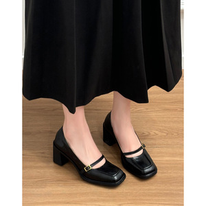 ウォッシュド牛革スクエアトゥブラック本革靴厚いヒール浅い口多用途靴レトロメリージェーンシューズ女性のハイヒール