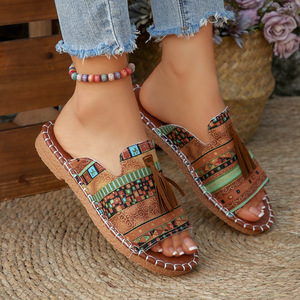 東南アジア貿易大きいサイズのタッセルフラットスリッパ女性のためのエスニックスタイル落書きソフトソールビーチサンダル
