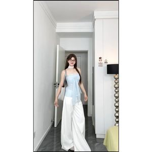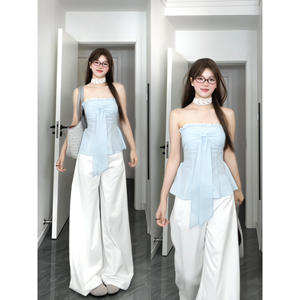 甘い純粋な欲望スタイルミントブルーリボンチューブトップ女性の夏のハイウエストブーツカットジーンズスーツ