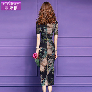 Feimengyi オリジナルプリント黒の新しい中国ドレス女性の夏の国民風レトロハイエンドレディチャイナドレス