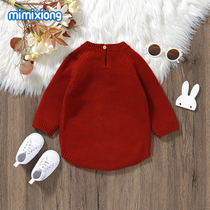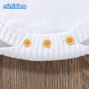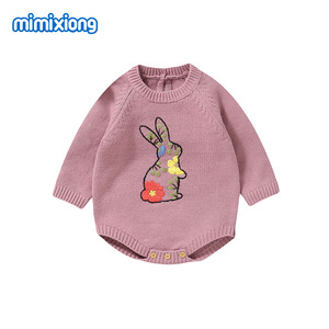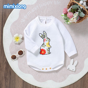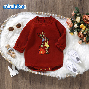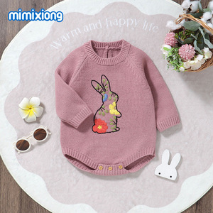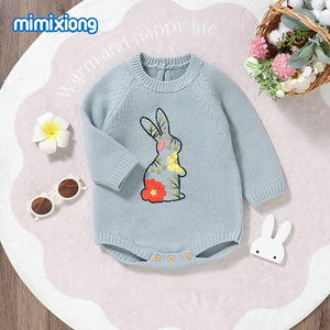INS热卖新款秋冬季长袖针织小兔子绣花图案婴儿包屁三角哈衣爬服