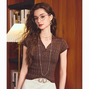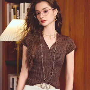 高品質でファッショナブルでクールなシルバーオニオンビーズVネックスモールフライングスリーブスリムセーターTシャツ女性用