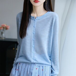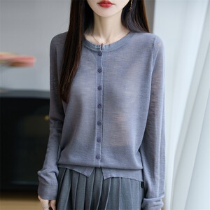 2025年夏季新款竹节麻圆领针织开衫长袖女纯色薄款宽松百搭防晒衫