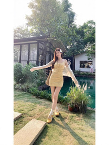 黄色蝴蝶结碎花吊带连衣裙夏季别致绝美海边度假风收腰系带沙滩裙