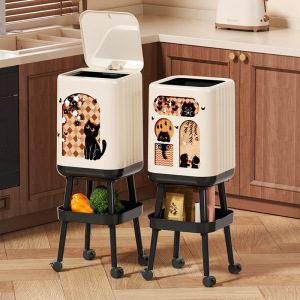 厨房增高垃圾桶家用带滚轮中古风免弯腰客厅带盖按压式厨余垃圾篓
