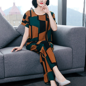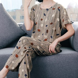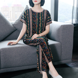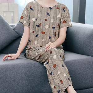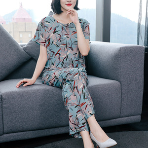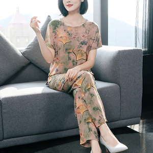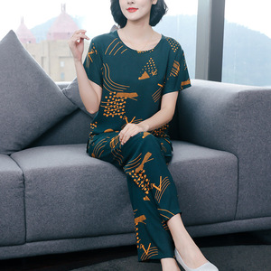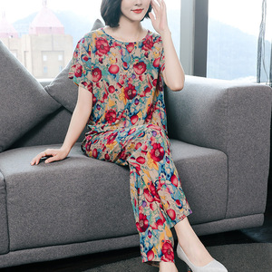 女性用パジャマ、夏用綿絹半袖、薄手、ゆったり、カジュアル、屋外で着用可能、綿絹、中高年向けホームウェア2点セット
