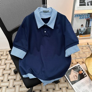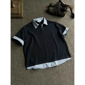 藏蓝色格纹假两件学院风polo领短袖衬衫夏高级感百搭T恤半袖上衣