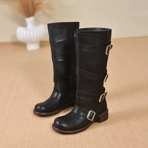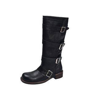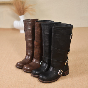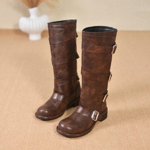 レトロナイトブーツ、ダメージ加工ウエスタンカウボーイブーツ、レディース秋冬新作ブーツ、ブラウン厚底太ヒール、ニーハイブーツ