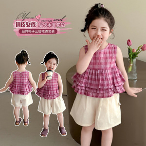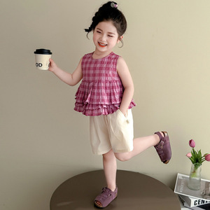 女の子の夏のスーツ 2025 新しい子供服女の赤ちゃんの夏の薄いノースリーブスプライシングスーツトレンディな子供服