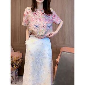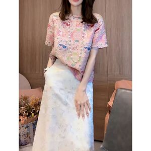 高级感轻奢国风裙套装夏季新款洋气提花圆领百搭上衣+半身裙7321