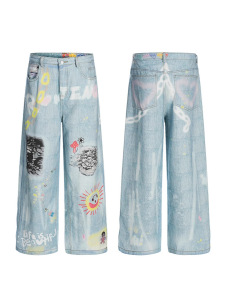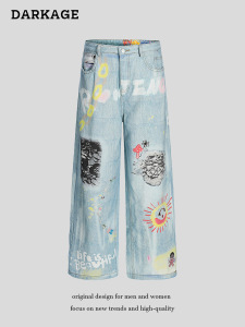 2025 多用途アメリカンレトロストリートグラフィティジーンズ男性と女性のためのトレンディな夏の新しいルーズストレートパンツ