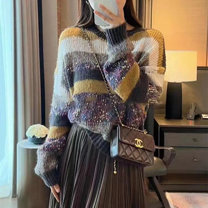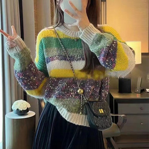 カラフルなストライプのプルオーバーレイジースタイル韓国セーター女性のための 2024 秋と冬ルーズアウターソフトワックス状セータートップ