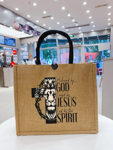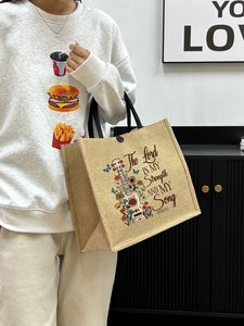 跨境爆款时尚复古图案印花手提包耐用黄麻手提包适合购物旅行跨境