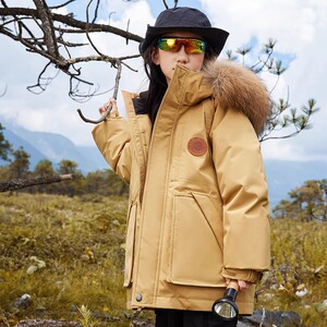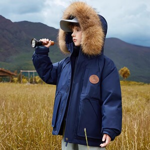 男の子と女の子向けの子供用ワークウェアダウンジャケット、中型および大型の子供用冬用暖かい大きなファー襟ジャケット、極寒のスーパーコットン厚手