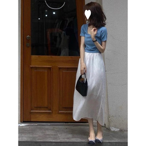 小柄な方向けの塩系、夏の女性向けの高級薄手ニット半袖Tシャツとスカートのセットです。