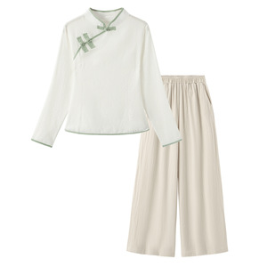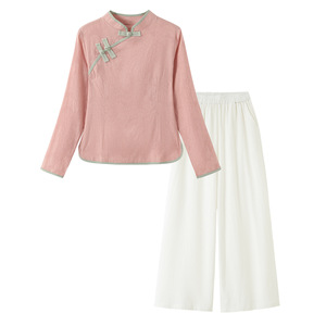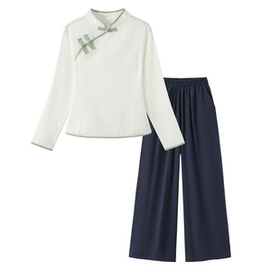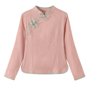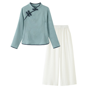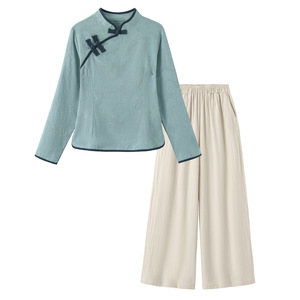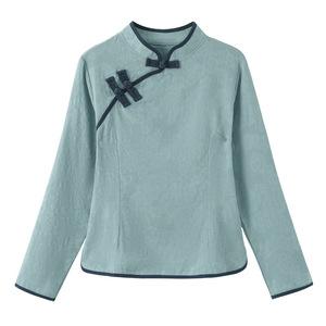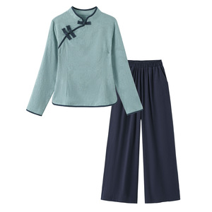 中国風の綿と麻の禅茶服女性唐装レトロ長袖トップ春と秋の国民風スーツ美容と健康