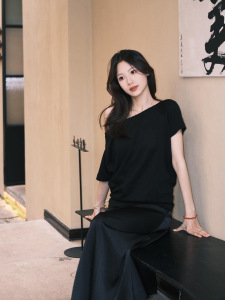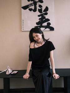 女性用オフショルダーブラック半袖Tシャツ、夏のホットガールスタイル、ルーズデザイン、オフショルダー、多用途通勤半袖トップスイン
