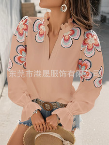 クロスボーダー貿易トップ Tiktok 新しいファッション V ネックパフスリーブフリルプリント無地 T レディースシャツ
