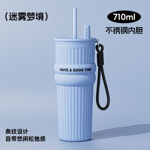 新しい女性用ストロー断熱カップ 2024 大容量カップステンレス鋼ライナー保冷ウォーターカップカジュアルシンプルな車のカップ