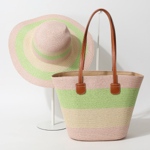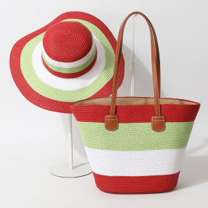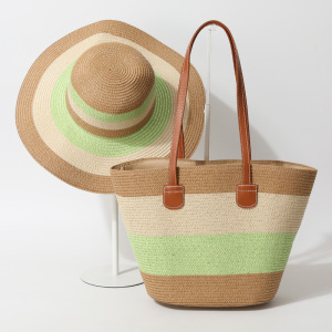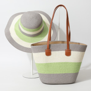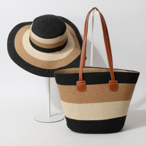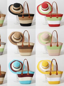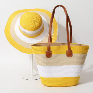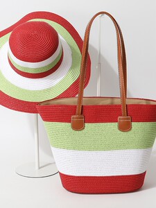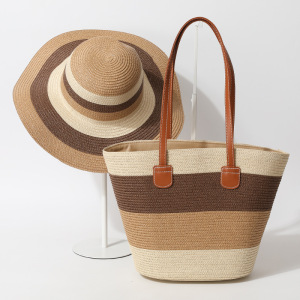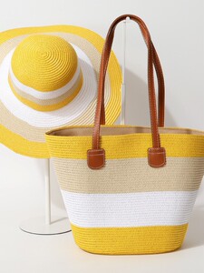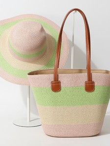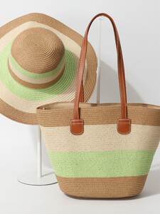 2025 新ストライプ織りわらバッグ夏大容量無地ハンドバッグショルダー通勤トートバッグクロスボーダー