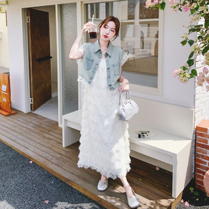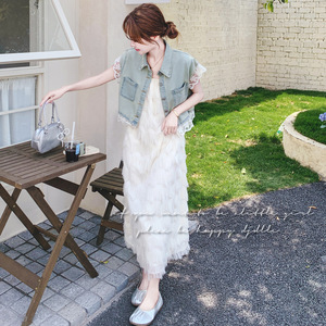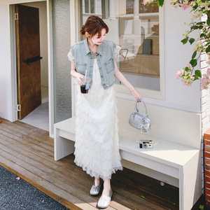 優しいスタイルのヘビーデューティータッセルサスペンダースカートスーツ女性の夏の新しいレースステッチデニムベスト2点セット