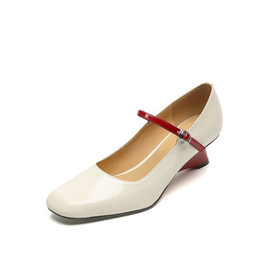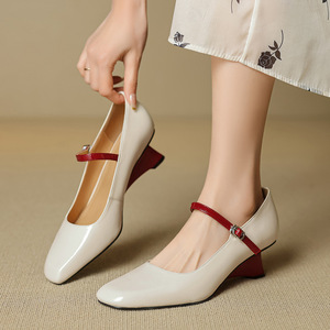 2025 春と秋のスクエアトゥメリージェーンシューズハイヒール特殊形状ヒールワンストラップ女性の浅いウェッジヒールの女性の靴