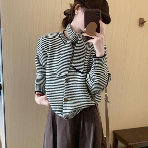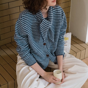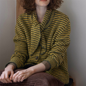 レトロストライプスカーフ襟デザインニットカーディガン女性のための 2025 秋と冬の新しいルーズハイエンドセータージャケット