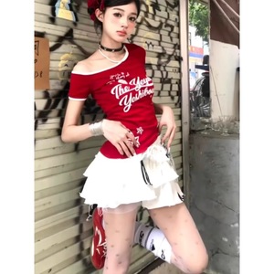 美式辣妹运动风斜肩红色短袖T恤女夏季修身显瘦不规则露肩上衣潮