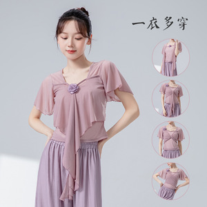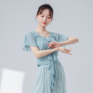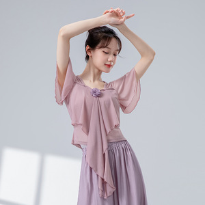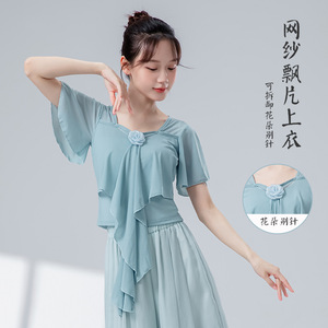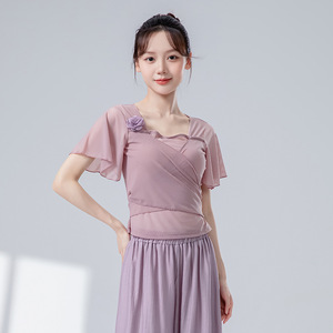 オリジナルデザインの女性用クラシックダンス練習服、夏用二層メッシュ、エレガントで妖精のような花の形をした半袖ガーゼ服
