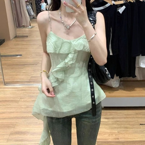 不規則なフリル裾キャミソールレディースデザイン超妖精スタイルウエストタイトシャツスカートトップ夏