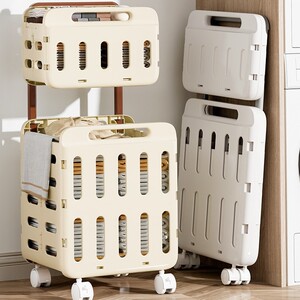 クリームホワイトのトロリースタイルの車輪付き折りたたみ式汚れた衣類バスケット