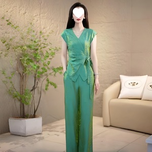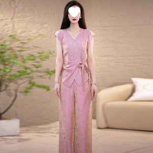 感时尚套装女夏季新款洋气显瘦V领短袖上衣阔腿裤休闲两件套