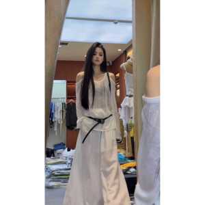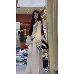 夏の韓国スタイルのレイジースタイルのリラックスした中空オフショルダールーズスリミングトップ女性用白ワイドレッグパンツスーツ