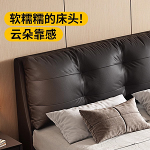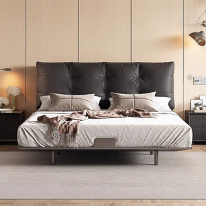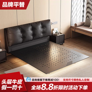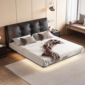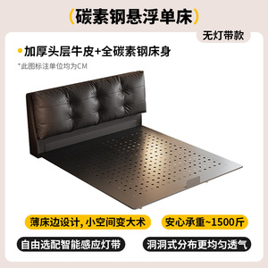 真皮软包床小户型齐边黑色碳素钢悬浮床带灯架主卧双人软包仙女床