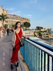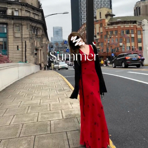 目を引く夏の婦人服 2025 新しい荒野ローズプリントサスペンダースカートレッドドレープデザインドレス