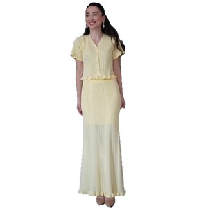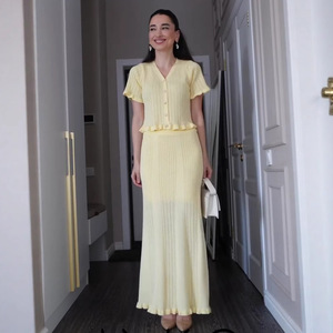 2025 夏の新ヨーロッパとアメリカのクロスボーダーライトイエロー V ネックニットスーツロングスカートスリムエレガントで快適なロングスカートスーツ