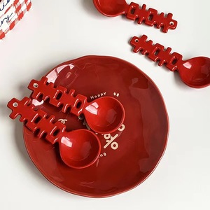 Yimi 中国オリジナルダブルハピネススプーン家庭用セラミックレッドウェディングデザートスプーン高価値スプーンペアスプーン
