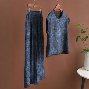 両面着用!ブルースターシルク香りの雲糸インク汚れドロップショルダースリーブマルベリーシルクTシャツ+ワイドレッグパンツ