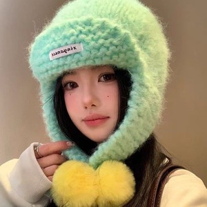 韩版毛球护耳雷锋帽女2025秋冬粉色显脸小帽子百搭保暖毛绒毛线帽