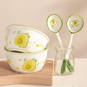 かわいいアボカド家庭用陶器丼 高価値クリーム色の丼 陶器丼 2個 2スプーン