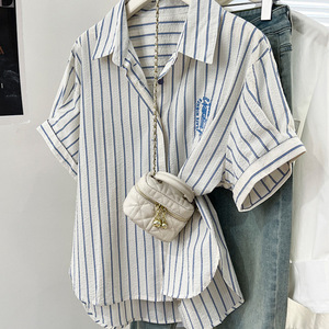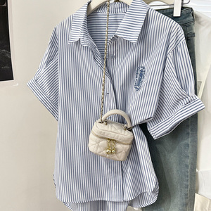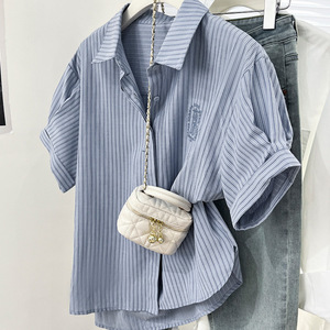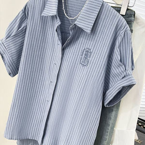 条纹刺绣正肩短袖衬衫女夏季大码设计感小众polo衬衣休闲宽松上衣
