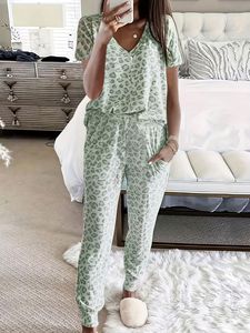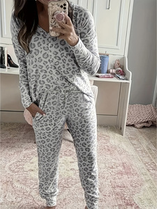 跨境欧美秋冬时尚休闲豹纹印花家居服睡衣套装爆款亚马逊两件套