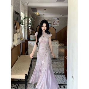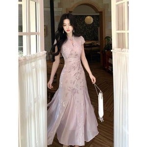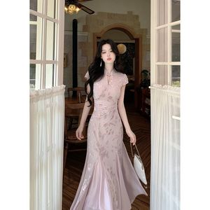 新しい中国風の改良されたチャイナドレス女性のための 2025 夏の新しいエレガントな気質ウエストフィッシュテールドレス