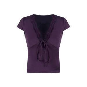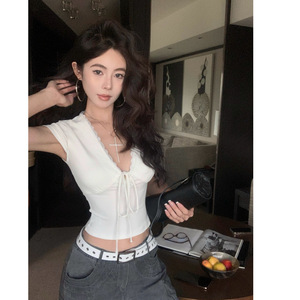 MR 【カット自由】レースステッチストラップVネック半袖Tシャツ レディース 夏 ピュアデザイントップス