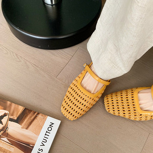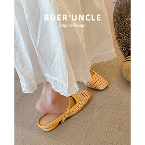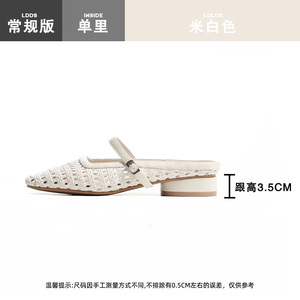 羊皮版!3cm内增高包头半拖女夏粗跟编织镂空玛丽珍凉拖鞋女外穿鞋