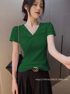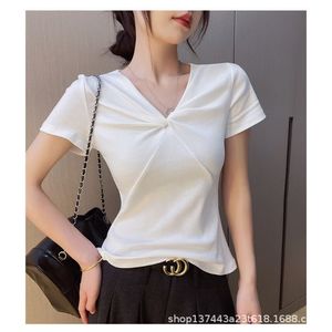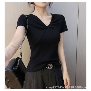 スモークグレー V ネック半袖 T シャツ女性のための夏 2025 新しい純粋な欲望ツイストデザイン右肩痩身シャツトップ