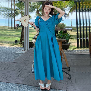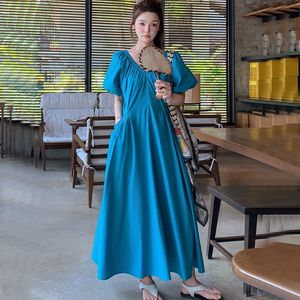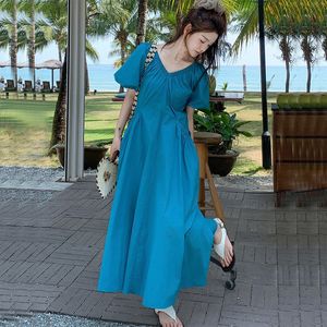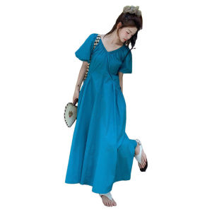 法式度假风蓝色后背系带连衣裙夏季新款高腰泡泡袖显瘦气质长裙