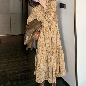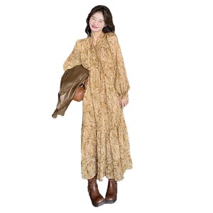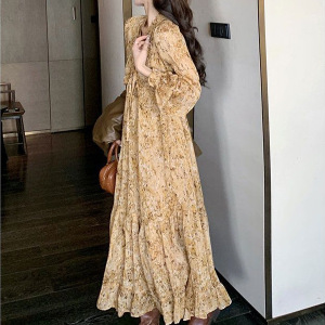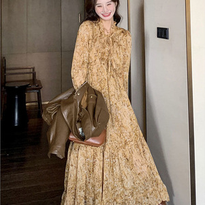 法式复古木耳边碎花连衣裙女2025春秋季新款韩版气质显瘦减龄长裙