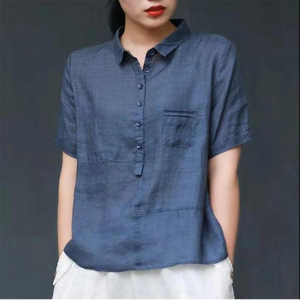 半袖コットンとリネンの女性の夏の2025新しい薄いルーズハイエンドレトロラペルシャツプルオーバーリネントップ