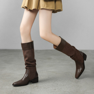复古方头褶皱骑士靴女2025秋冬拼接粗跟长筒靴堆堆靴中筒靴瘦瘦靴